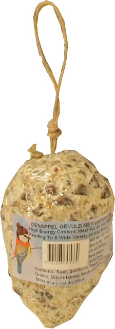 Dennenappel gevuld met wintervoer om op te hangen.