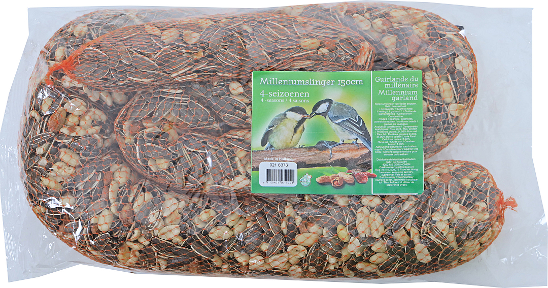 De Millennium mixslinger heeft een totale lengte van ongeveer 150 cm en bevat o.a. zonnebloempitten en gepelde pinda's. Hang deze millennium mixslinger op in jouw tuin en je zult een grote verscheidenheid aan vogels aantrekken.