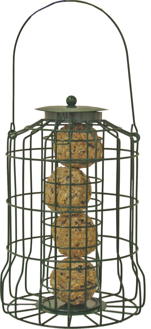 Metalen voersilo met beschermende draadbol voor mezenbollen. Gemakkelijk te vullen en schoon te maken.