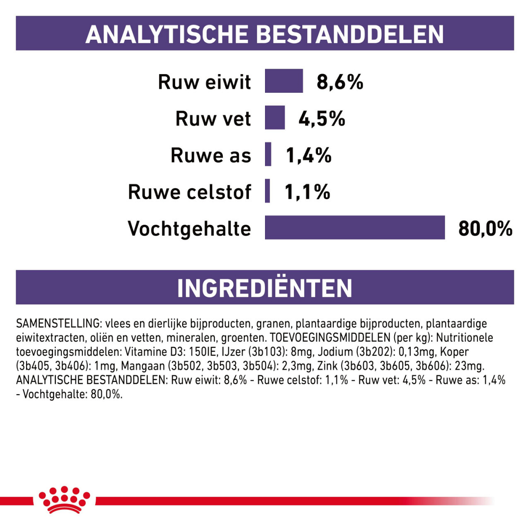 Neem contact op met jouw dierenarts om te bepalen wat de beste voeding is voor jouw huisdier. Mocht je overschakelen naar deze voeding, doe dit dan geleidelijk in een tijdsbestek van 7 dagen. Zorg dat je elke dag zorgvuldig de juiste hoeveelheid voeding afweegt, zeker in combinatie met natvoeding.