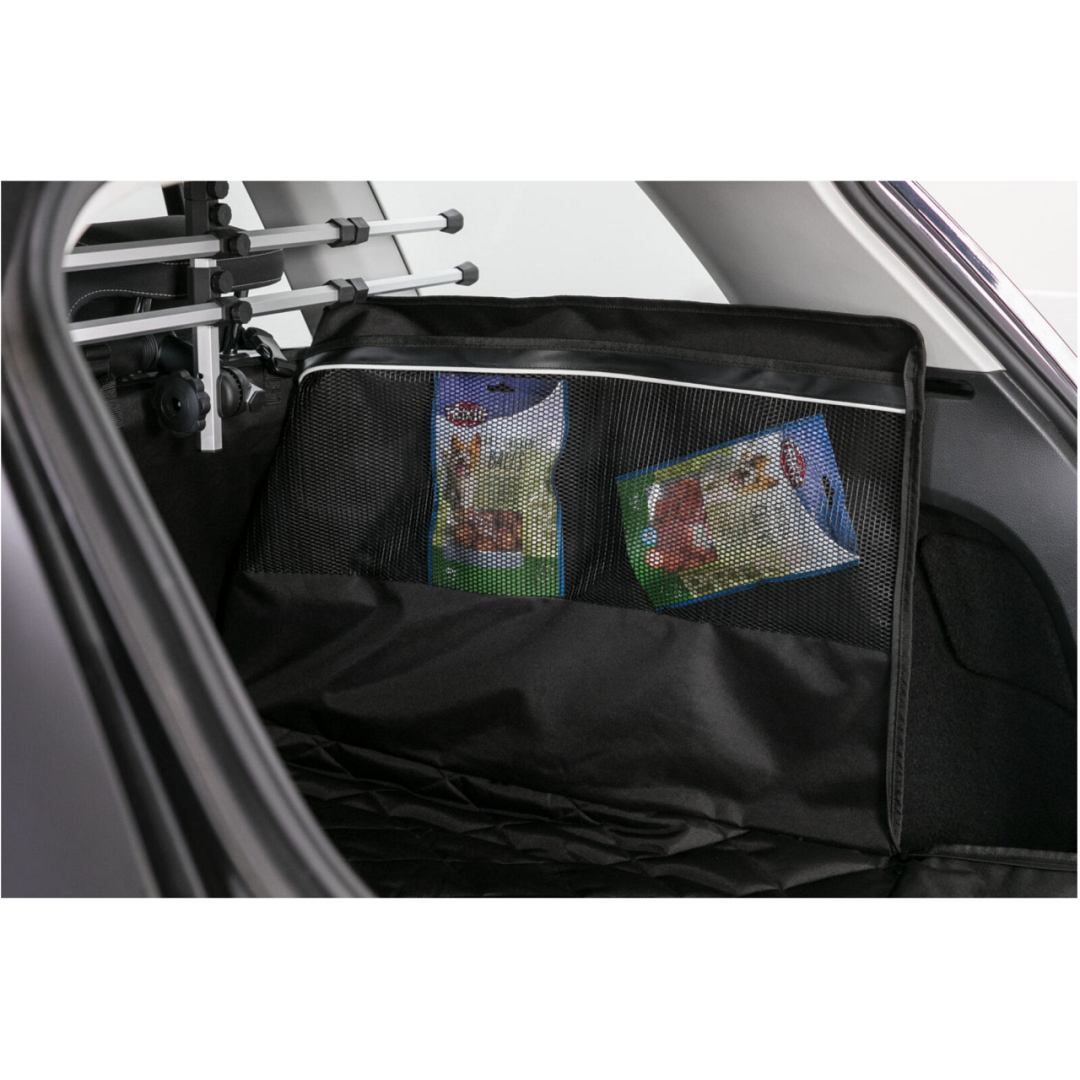 De TRIXIE kofferbakdeken heeft hoge zijkanten die de kofferbakbekleding beschermen. De deken wordt bevestigd aan de hoofdsteunen met gordels en aan de zijkanten met klittenband.