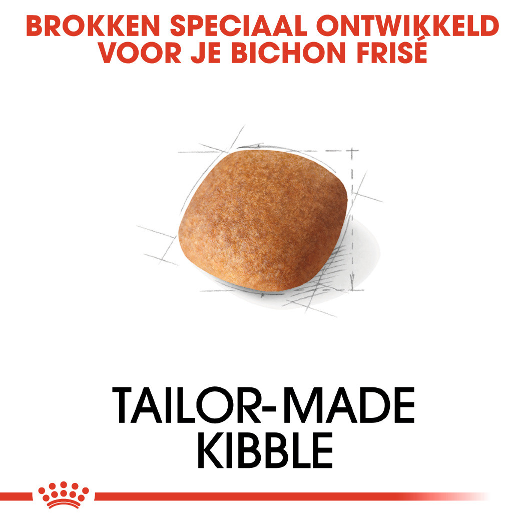 Met een gemiddelde hoogte van 25 centimeter is de Bichon Frisé klein, maar elegant. Zijn hoofd trots en hoog. Zijn ogen levendig en expressief. En zijn staart hoog en gracieus over de rug gedragen. Wie loopt er nu niet graag met zo'n hondje? Speciaal voor deze elegante hond hebben we bij Royal Canin Bichon Frisé Adult ontwikkeld.
