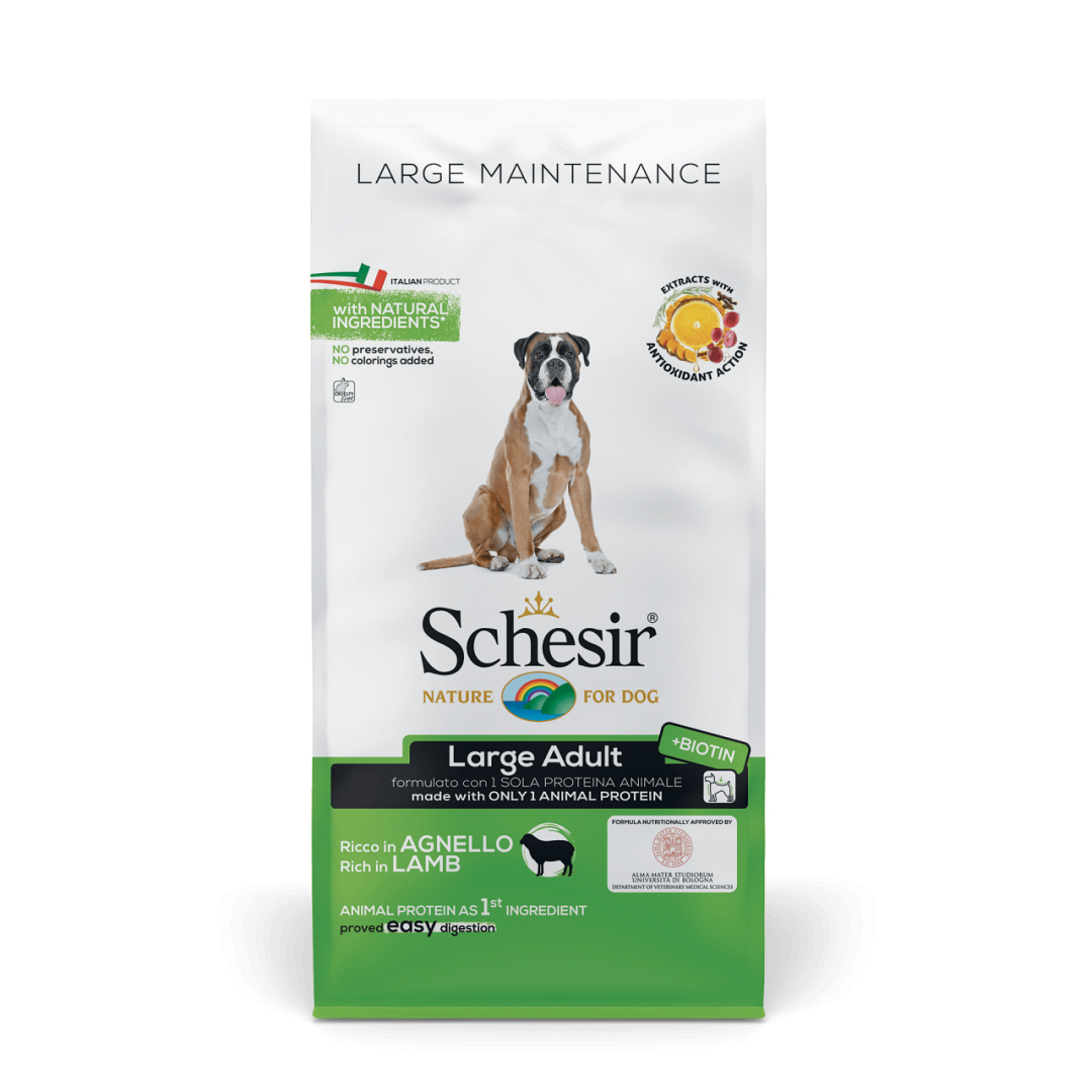 Schesir Large Lam is samengesteld met een enkele bron van dierlijke proteïne (lam), dat ook het hoofdbestanddeel is. Deze smakelijke, complete en uitgebalanceerde voeding is lichtverteerbaar en voldoet aan de voedingsbehoeften van volwassen, grote honden. Het is geïntegreerd met glucosamine en chondroïtine, om een goede gewrichtsfunctie te behouden.