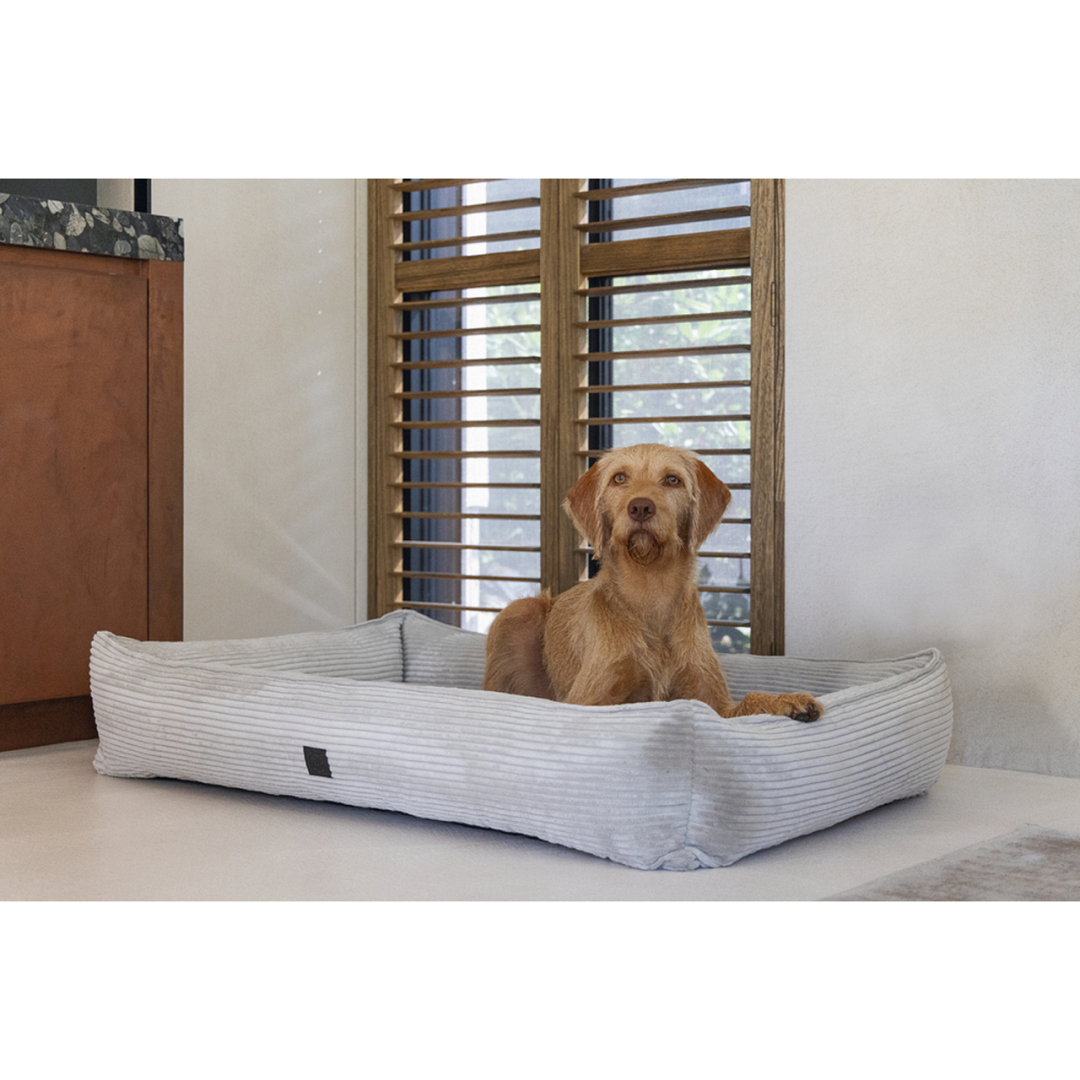 Mooie mand van geribbelde stof met vlokkenvulling en antislip. De hoes is machinewasbaar.