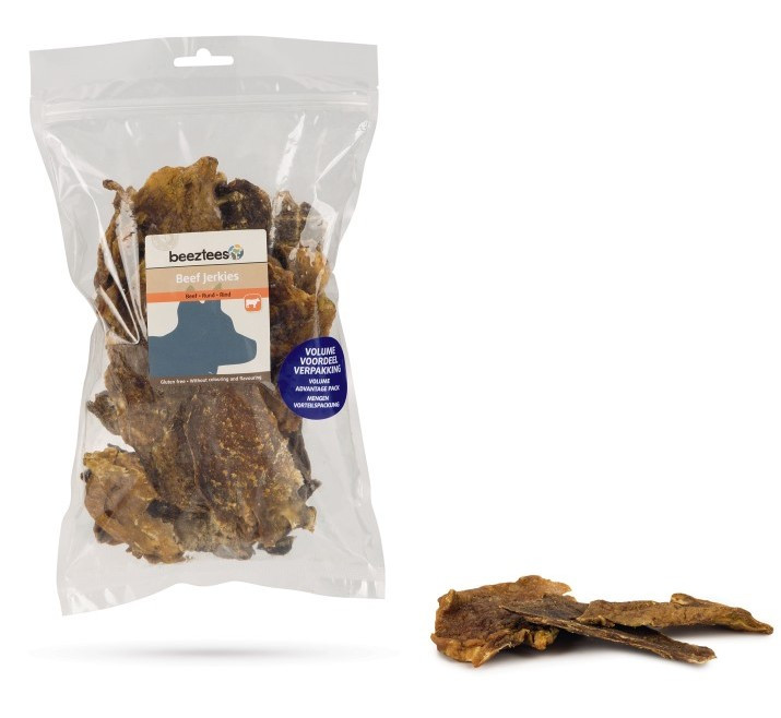 Beeztees Beef Jerkies is een lekker en gezonde snack voor jouw hond. De lekkernij is gemaakt van platte stukken gedroogd rundvlees en bevat verder geen toegevoegde kleur- of smaakstoffen. De snack is geschikt als beloning of gewoon als tussendoortje.