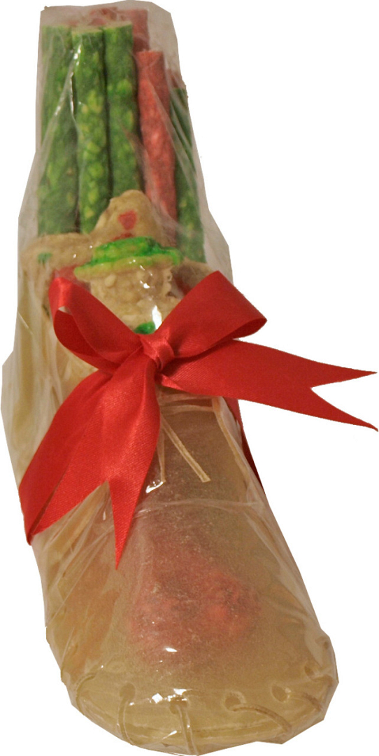 Feestelijke kauwschoen van buffelhuid, gevuld met munchy kauwstaafjes.