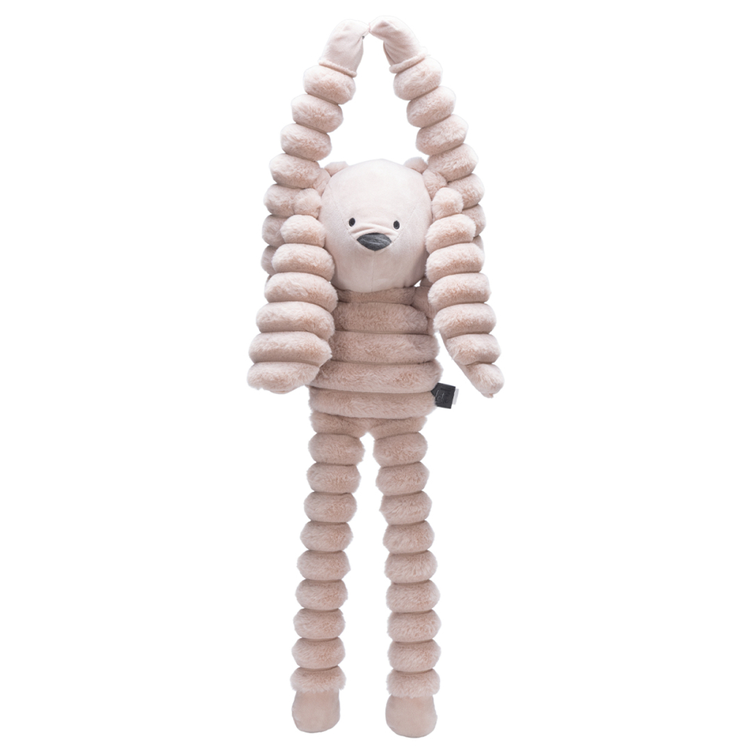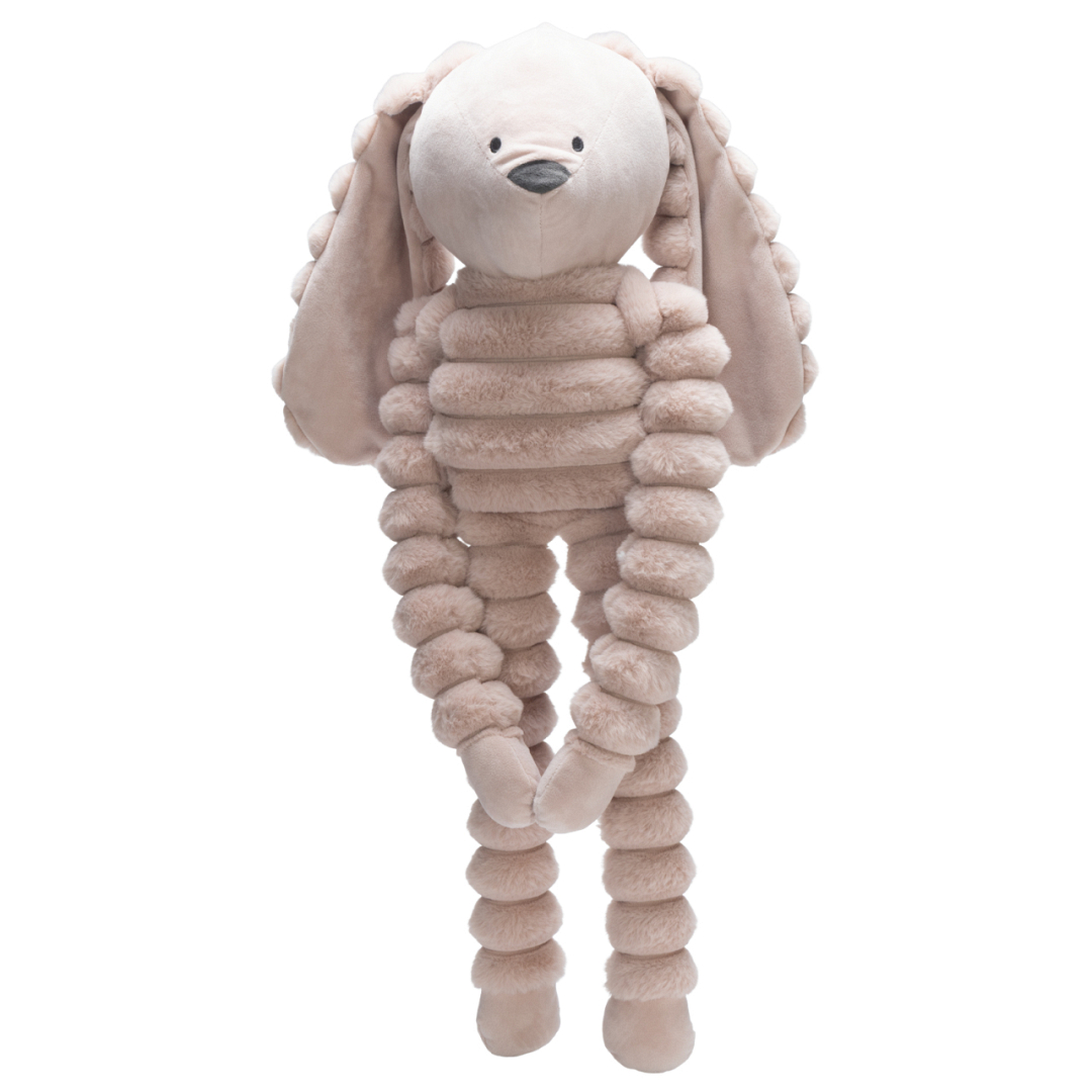 De Designed by Lotte Reza hang konijn is een grote hondenknuffel met lange armen en benen, perfect om mee te knuffelen en spelen. Dit zachte konijn is gemaakt van een combinatie van pluche en ribstof, wat dit hondenspeelgoed extra fijn maakt voor honden die graag kroelen.