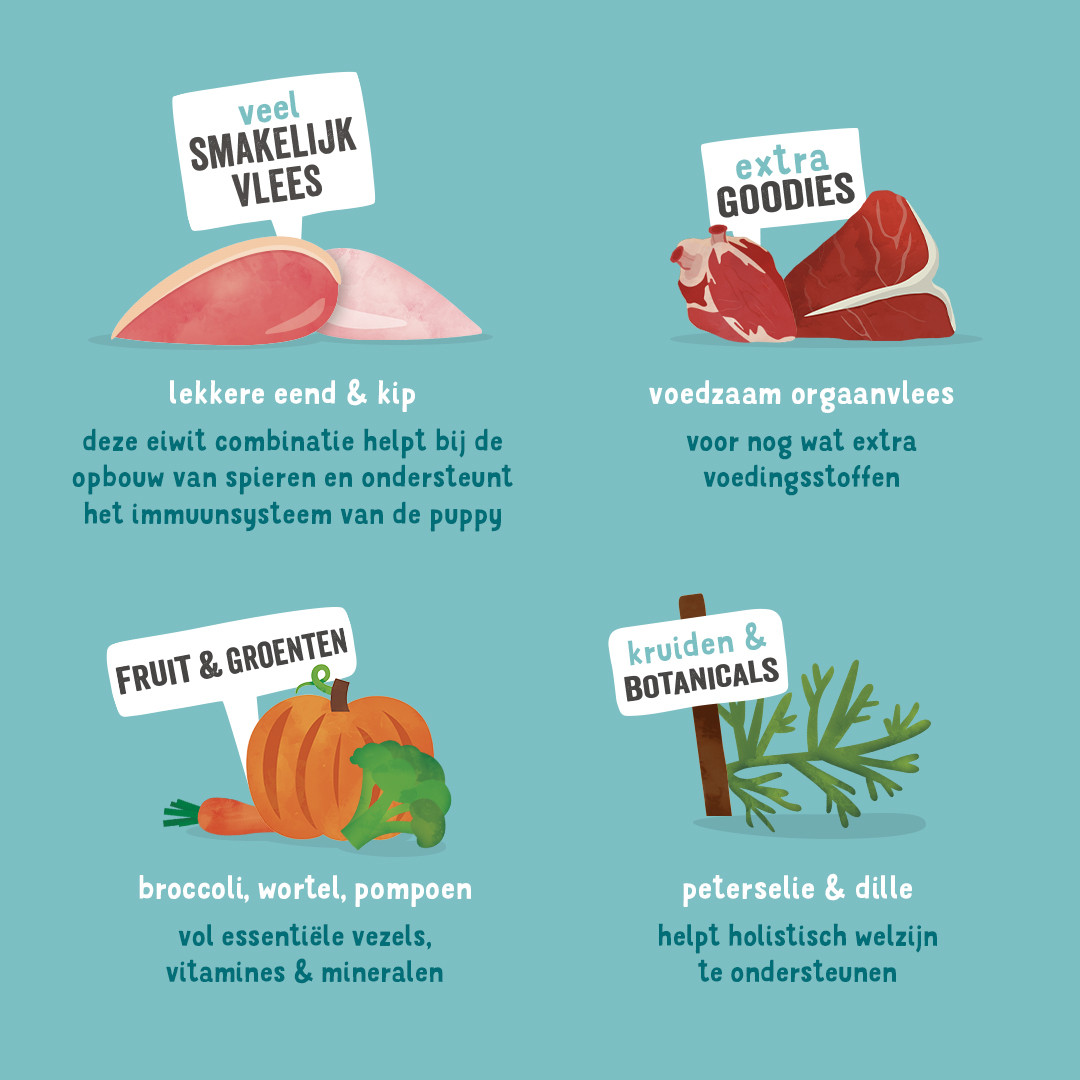 Graanvrij hondenvoer met eend en kip voor puppy's.