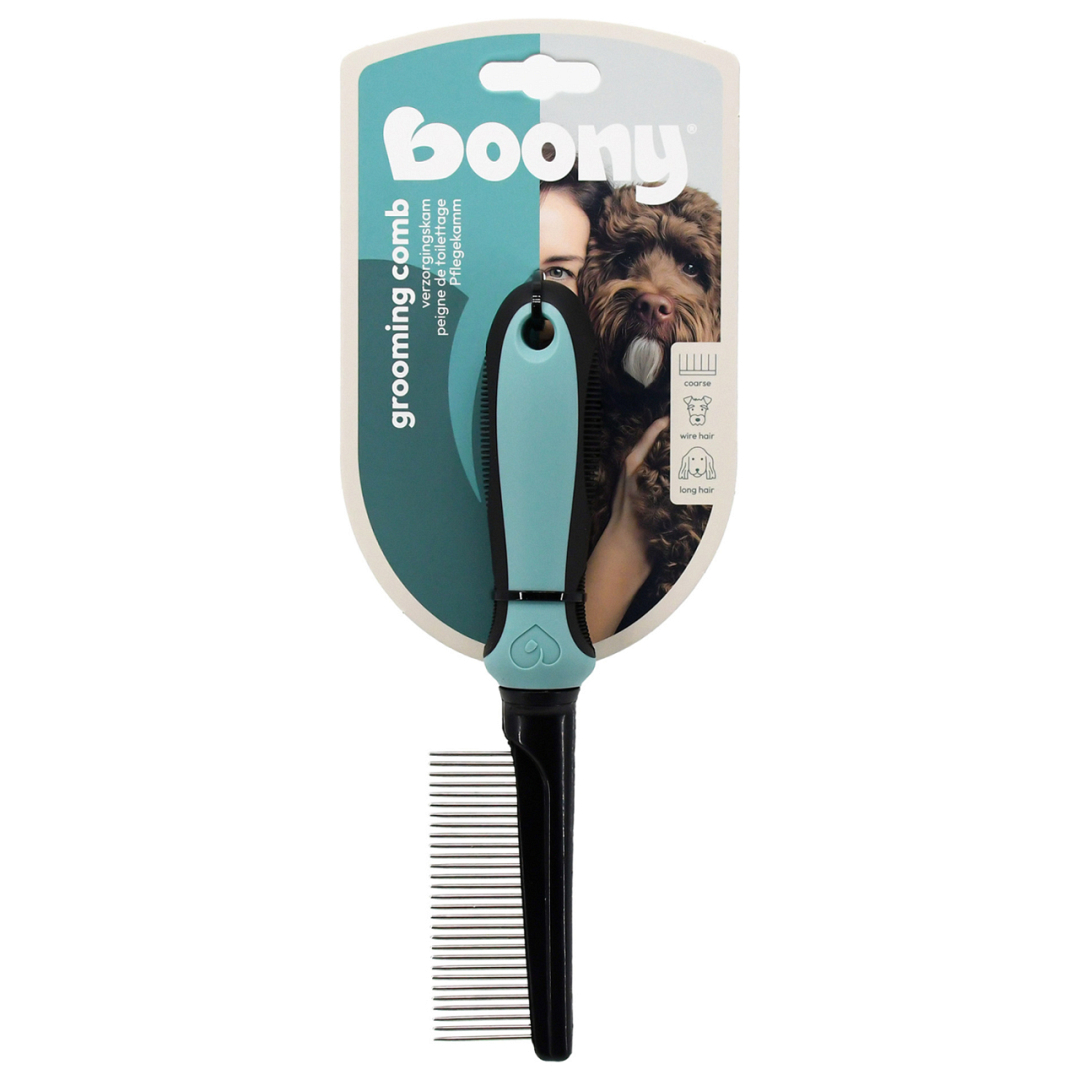 Deze Boony Grove verzorgingskam is ontworpen voor de intensieve verzorging van honden met een dikke vacht. De kam maakt de vacht los en verwijdert op een efficiënte manier losse haren, vuil en eventuele klitten. Zo houd je de vacht fris, luchtig en in optimale conditie.