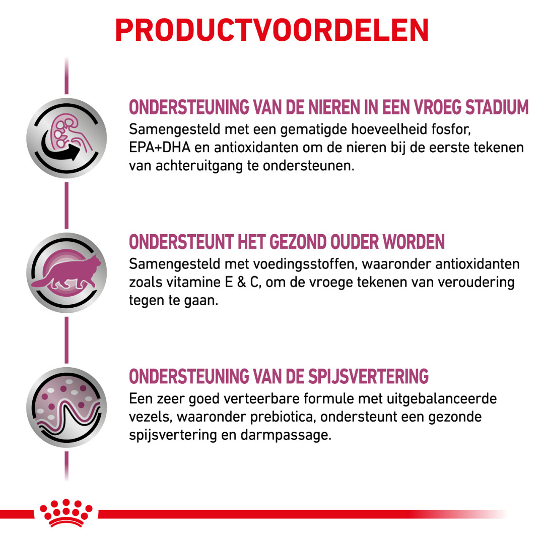 Volledig dieet natvoer voor volwassen katten ter ondersteuning van de nierfunctie in de vroege stadia van chronische nierinsufficiëntie.