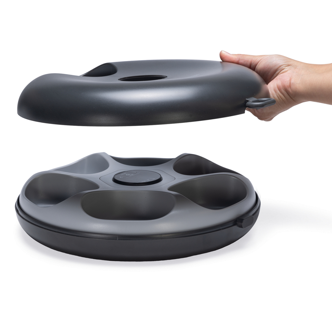 Beeztees automatische voerbak Onni is de ideale automatische voerbak voor katten en kleine honden. Met een capaciteit van 6 bakjes van 180 ml biedt deze voerautomaat ruimte tot 6 maaltijden per dag. Deze voerautomaat is ontworpen voor zowel nat- als droogvoer. Het wordt geleverd met 2 uitneembare koelelementen die in de vriezer kunnen worden geplaatst en het voer tot wel 24 uur vers houden. De voerautomaat is ontworpen voor eenvoudig onderhoud 90% van de onderdelen zijn demonteerbaar en kunnen in de vaatwasser worden gereinigd, met uitzondering van de hoofdunit. De voerbak werkt op een USB-oplaadbare 3600 mAh lithiumbatterij, die na 6-8 uur opladen tot 30 dagen meegaat. Een handige oplaadindicator waarschuwt je wanneer de batterij bijna leeg is.
