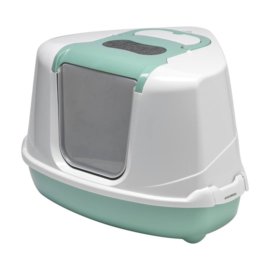 Moderna kattentoilet Flip Corner is een mooi vormgegeven kattentoilet voor in de hoek. De naar boven openklapbare deur zal het dagelijkse schoonmaken van de kattenbak vergemakkelijken. Beschikt over een handvat en een semi-doorschijnende deur voor extra privacy. Gemaakt van premium kwaliteit 100% gerecycled plastic voor langdurig gebruik. Inclusief kattenbakschep.