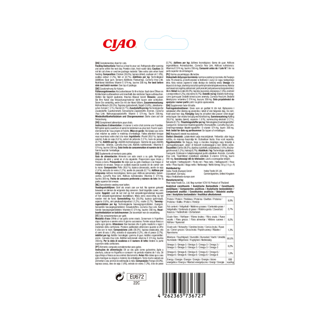 Churu puree Skin & Coat kattensnack ondersteund een gezonde huid en vacht en maakt tussendoortjes leuk voor kat en baasje. Jouw kat zal dol zijn op deze smakelijke en leuke traktatie die gemaakt is om met de hand te voeren. Churu bevat veel vocht en wordt geleverd in een gemakkelijk te openen verpakking. Het bevat slechts een tiende van de calorieën van een droge snack.