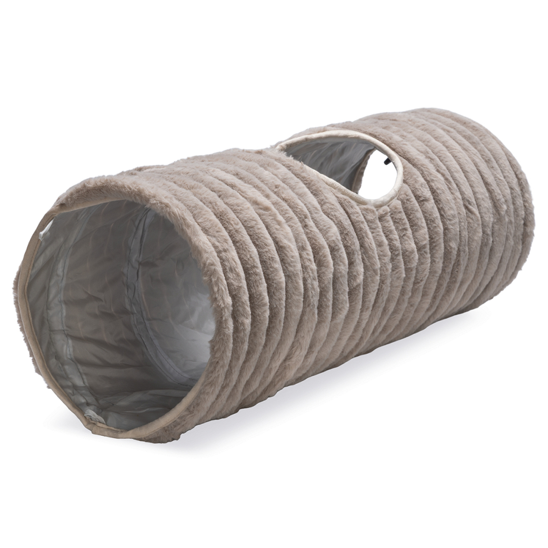Kattentunnel van prachtige ribstof, met doorkijkgat halverwege voor extra speelplezier. Plat op te bergen.
