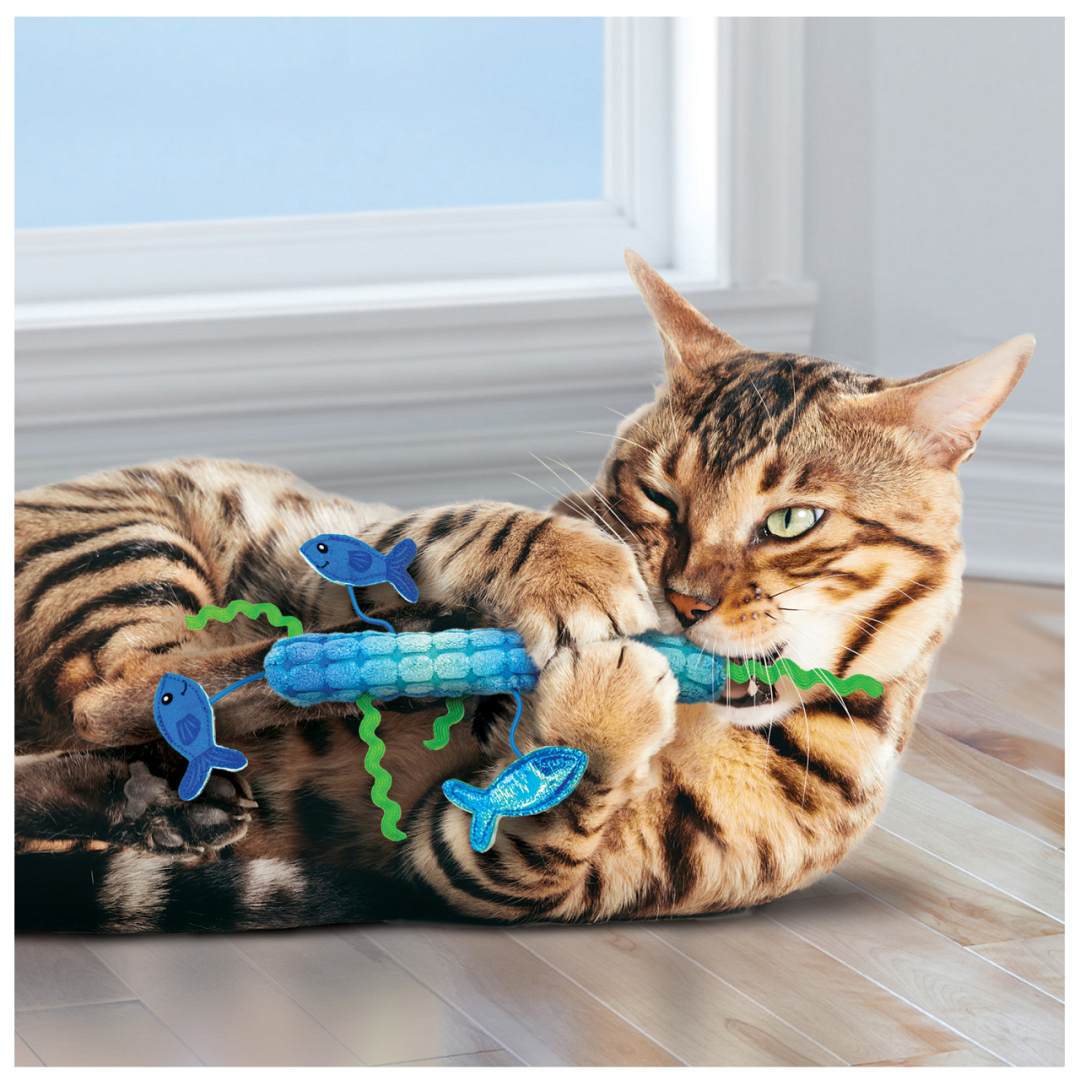 De KONG Kickeroo Stickaroo is een langwerpig speeltje met een ribbelstof. Aan dit product zitten visjes met elastiekjes waar jouw kat naar hartenlust mee kan spelen. De groene stukjes zeewier zorgen ervoor dat je kat nog meer elementen heeft om zijn of haar natuurlijke jachtinstincten te stimuleren. De langwerpige vorm zorgt er ook voor dat je kat goed met dit speeltje kan stoeien en zijn trap- en schopbehoefte kan uiten. De Kong Premium Catnip zorgt voor nóg meer aantrekkingskracht.