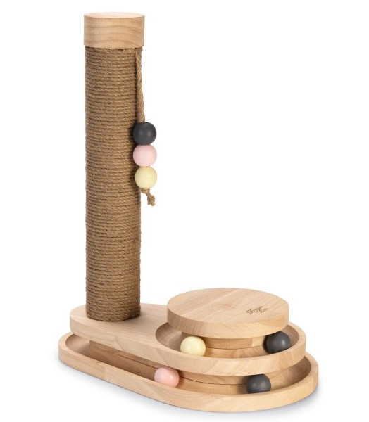 Rubberhouten krabpaal met leuke speeltoren met balletjes. Omwikkeld met jute touw voor het slijpen en verzorgen van de nagels. Afm. 38 x 24,5 x 47,5 cm.