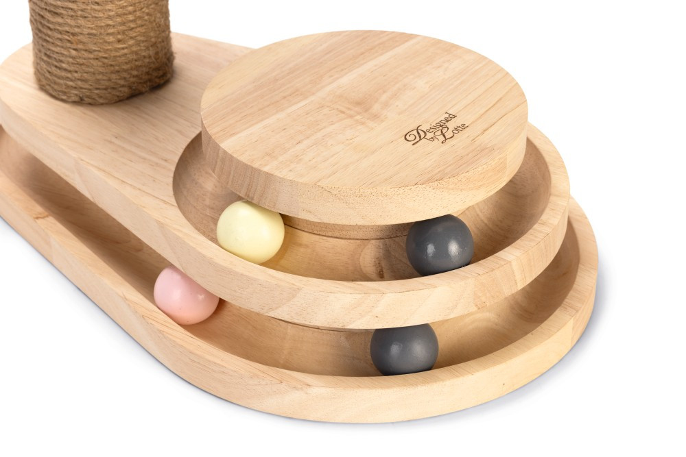 De Designed by Lotte Krabpaal Inez is een multifunctionele krabpaal. Deze krabpaal heeft naast de gebruikelijke krabstam ook nog een leuke speeltoren aan de voet bevestigd. Deze speeltoren is voorzien van balletjes. Zodra jouw kat met zijn poot of snuit tegen de balletjes tikt, zullen deze alle kanten op rollen.