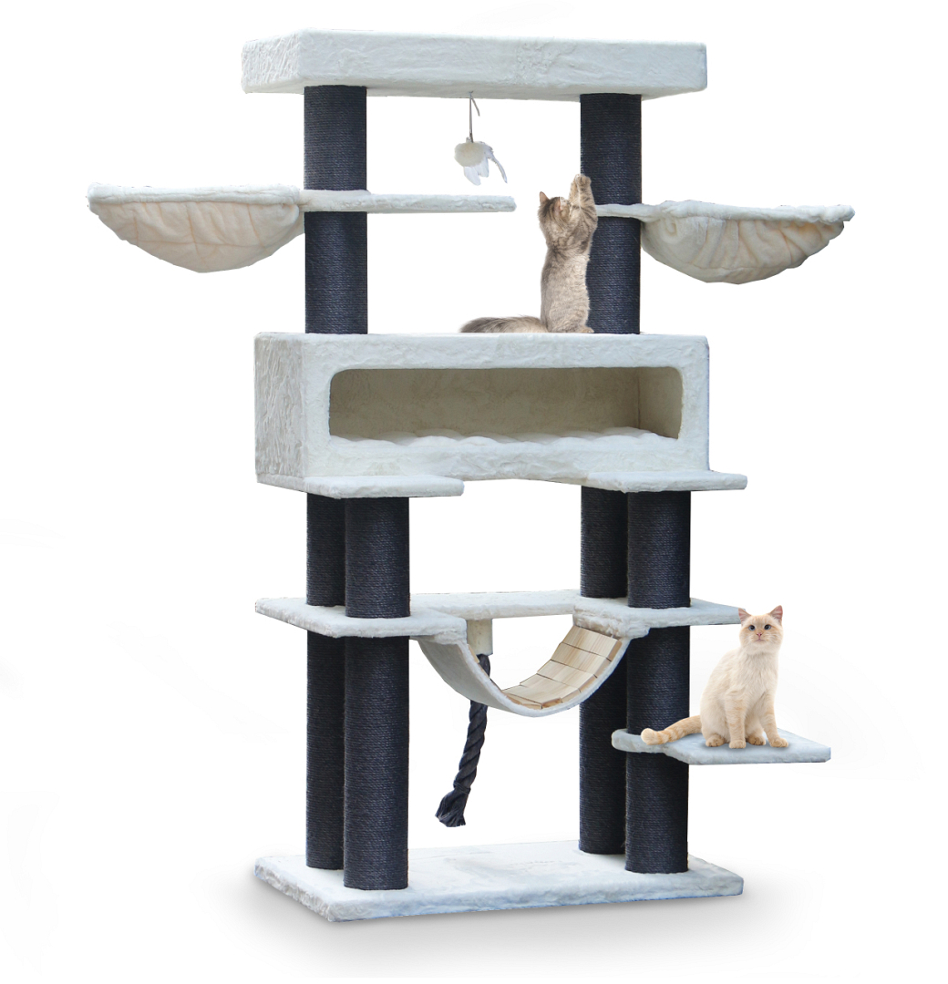 Robuust kattenmeubel van pluche en sisal. Bevat twee hangmatten, een houten brug en een loungemand. Afm. 100 x 60 x 198 cm.