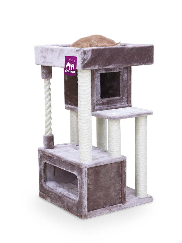 Petrebels krabmeubel Sweet Petite Lodge 107 is stoer, stabiel en lekker groot. De krabpaal Lodge 107 is een plek waar kittens en kleine katten al hun energie op kwijt kunnen. Aan de dikke krabstammen kunnen ze lekker krabben, maar ze kunnen er ook in klimmen. Helemaal bovenin staat een supergrote en fluweelzachte loungemand. Het krabmeubel bevat ook twee royale slaaphuisjes.