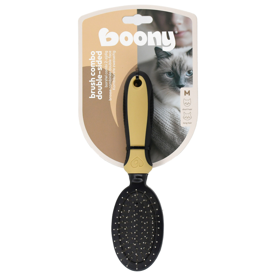 Deze praktische combi-borstel van Boony biedt twee essentiële borstels in één handig product, perfect voor kattenliefhebbers die op zoek zijn naar gemak, effectiviteit en veelzijdigheid. De borstel combineert een nylon zijde voor het verwijderen van vuil met een stalen zijde voor het losmaken van dode en losse haren.
