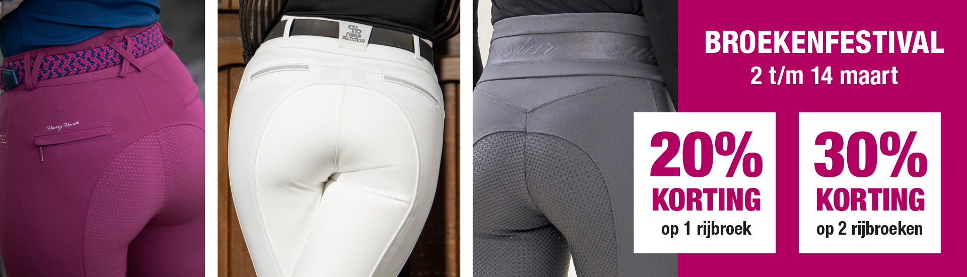 Ons welbekende broekenfestival is weer terug. Kom van maandag 2 t/m zaterdag 14 maart naar onze ruitersportafdeling en profiteer van mooie kortingen op alle rijbroeken die aanwezig zijn in de winkel.