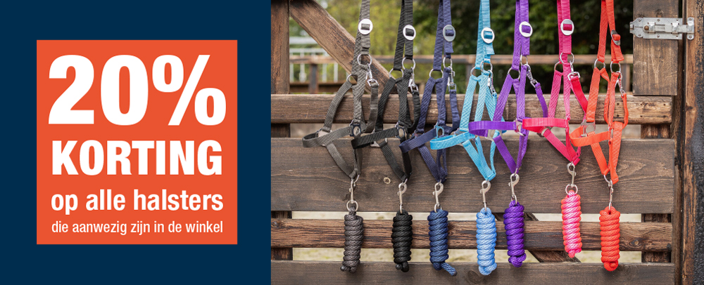 Op zoek naar een nieuw halster voor je paard? Van maandag 16 t/m zaterdag 28 februari ontvang je 20% korting op al onze halsters in de winkel*. Mis deze kans niet om je paard te voorzien van een comfortabel en stijlvol halster tegen een voordelige prijs!